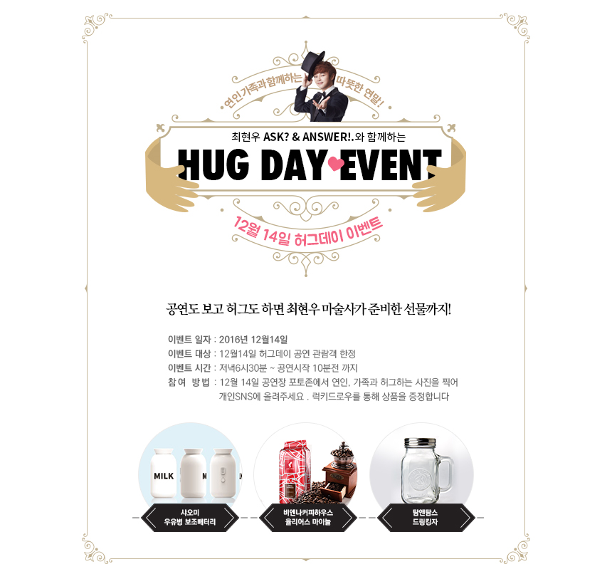 이벤트 대상 : 12월 14일 허그데이 공연 관람객 한정벤트 시간 : 저녁 6시 30분 ~ 공연시작 10분전까지