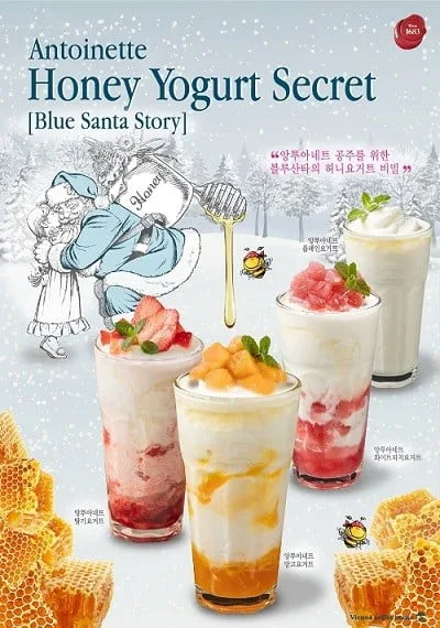 비엔나커피하우스의 요거트 음료는 상큼함과 청량감이 돋보이는 과일과 요거트가 조화를 이뤄 무더운 여름 가볍게 즐길 수 있도록 만들어졌다. 앙투아네트를 사랑한 블루산타의 비밀 레시피 '꿀'을 이용해 달콤하면서도 중독성 있는 맛을 선사한다.